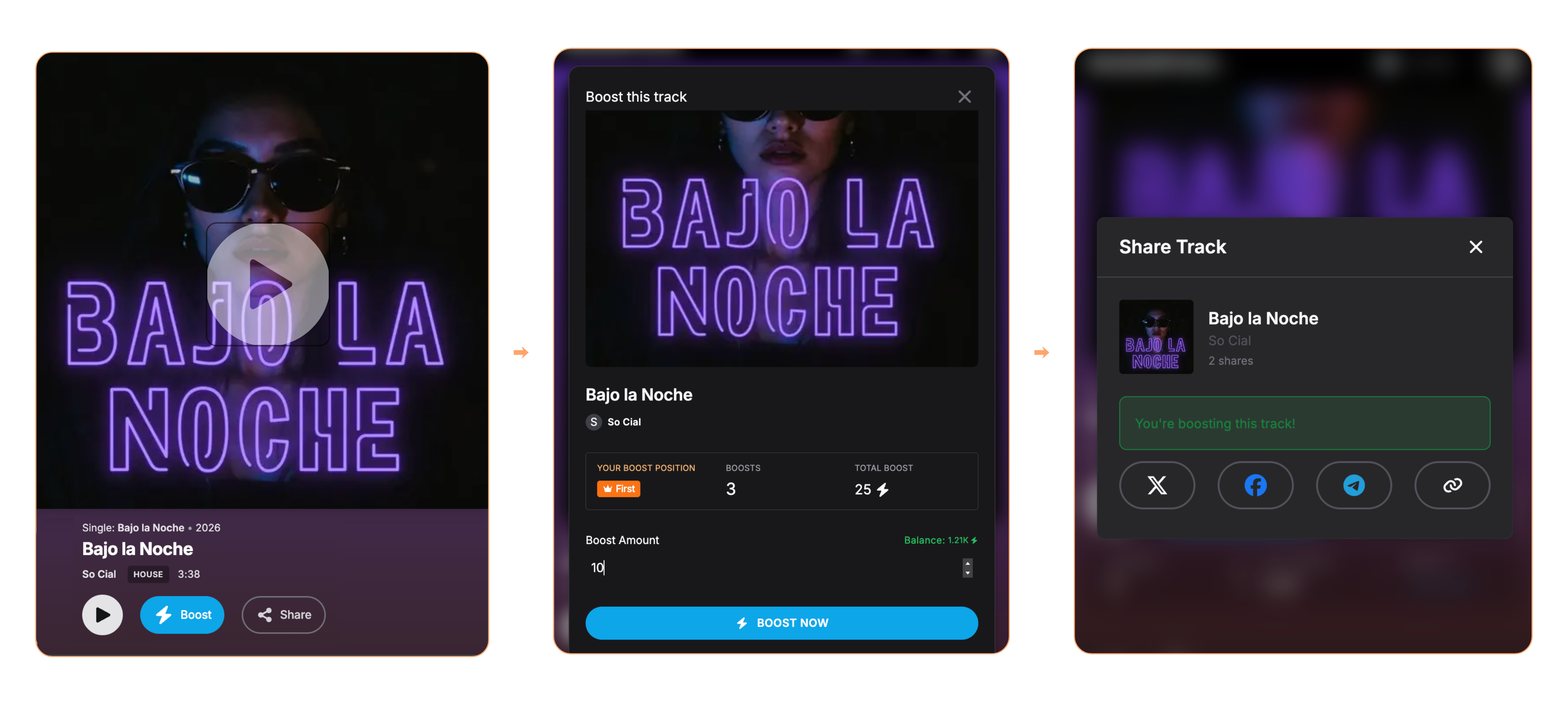 Help artists get discovered by streaming, boosting (voting), and sharing music.