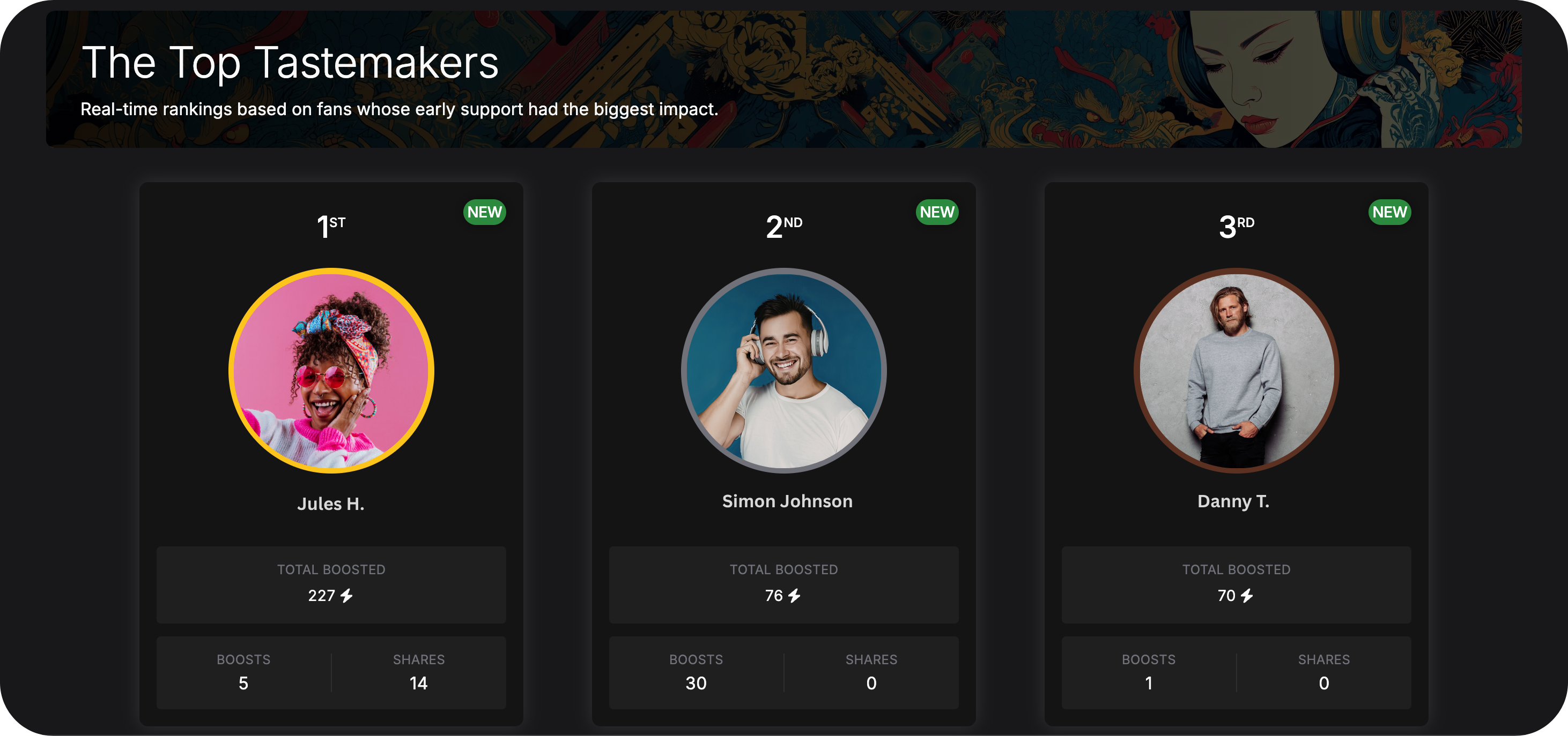 Each week tastemakers and fans earn weekly records for their participation and impact.